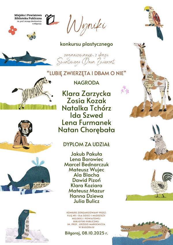 Z okazji Światowego Dnia Zwierząt obchodzonego 4 października w Filii bibliotecznej dla Dzieci i Młodzieży zorganizowano konkurs plastyczny "Lubię zwierzęta i dbam o nie"