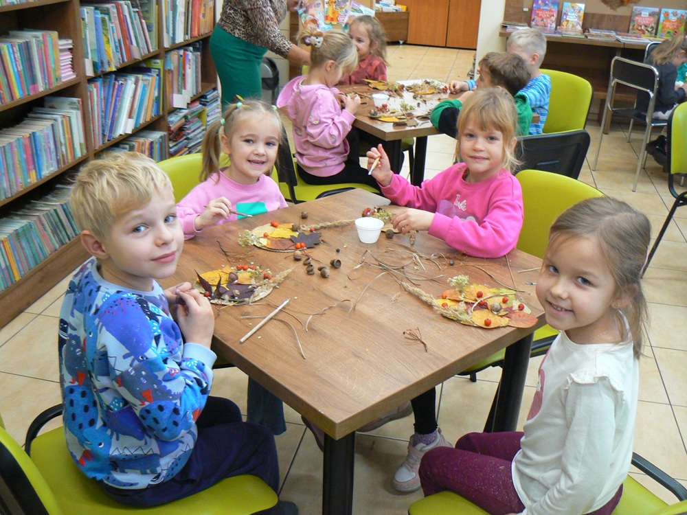 Przedszkolaki ze Szkoły Podstawowej Nr 1 w Biłgoraju uczestniczyły w warsztatach plastycznych "Dary jesieni". Dzieci robiąc kompozycje z liści drzew, malutkich szyszek, żołędzi, jarzębiny uczyły się łączenia różnych form i kolorów. Delikatne suszone liście wymagały od dzieci uwagi i precyzji. Obcowanie z bogactwem naszej natury okazało się niezwykłą kreatywną i edukacyjną zabawą.